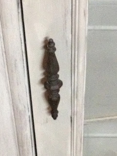 I did a wash of Paris Gray Chalk Paint over the whole hutch, leaving some areas uncovered to show the natural wood. I then did a little "spot antiquing" by taking some Graphite Chalk Paint and adding it to corners so that they looked a little worn. I also took of the hardware, painted them in Graphite Chalk Paint and then waxed with a dark wax to finish it off.